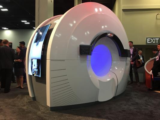 The Reflexion combination PET-CT linac, on display at ASTRO 2018. The system uses PET radiotracer emissions to track tumors directly without the need for margins to account for respiratory motion.