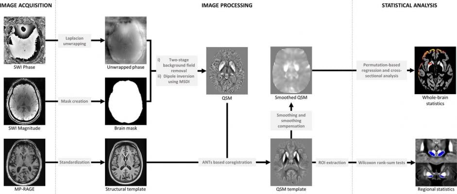Summary steps of the processing pipeline for QSM reconstruction (phase pre-processing and map estimation) and whole brain/regional analysis. ANTs, advanced normalisation tools; MP-RAGE, magnetisation-prepared, 3D, rapid, gradient-echo; MSDI, multi-scale dipole inversion; QSM, quantitative susceptibility mapping; ROI, region of interest; SWI, susceptibility weighted imaging.