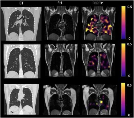 Hp-XeMRI has shown promise in detecting abnormalities of alveolar gas exchange—where oxygen moves from the lungs to the bloodstream and carbon dioxide passes from the blood to the lungs—even when CT scans and lung function tests were normal. Hp-XeMRI enables the assessment of ventilation and gas exchange into red blood cells. It provides regional information of pulmonary vasculature integrity and may be able to identify lung abnormalities not apparent on CT.