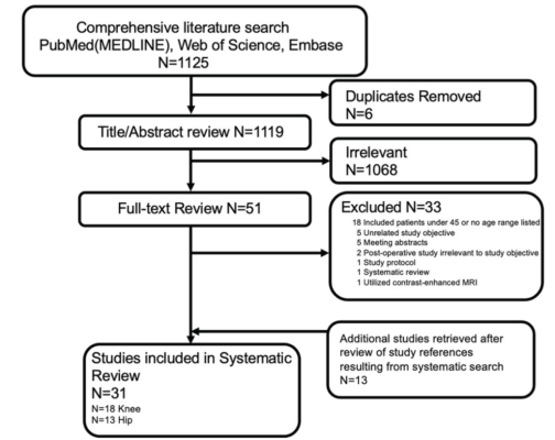 Alaia et al. performed a systematic review and meta-analysis of PubMed, Web of Science, and Embase through October 3, 2022, to identify original research pertaining to whether MRI-diagnosed hip or knee pathology in patients 45 years old and older correlates with symptomatology or benefits from arthroscopic surgery. After extracting publication information, study design, cohort size, osteoarthritis severisty, age range and mean, measured outcomes, minimum follow-up length, and MRI field strength, study methods were appraised via NIH Quality Assessment Tools. Of the 1,125 potential studies the AJR authors identified, 31 (18 knee, 13 hip) met the inclusion criteria. Knee studies (10 prospective, eight retrospective) included 5,907 patients (age range, 45–90 years); hip studies (11 retrospective, two prospective) included 6,385 patients (age range, 50–85 years).