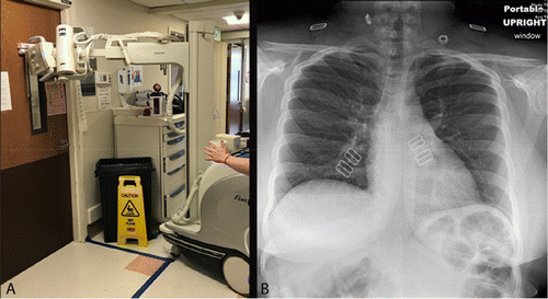 Chest radiography through glass. Technologists position the portable X-ray unit outside the patient room, with the tube peering through the wire-reinforced isolation room window (A). AP chest X-ray through obtained is of diagnostic quality (B). Courtesy of the journal Radiology