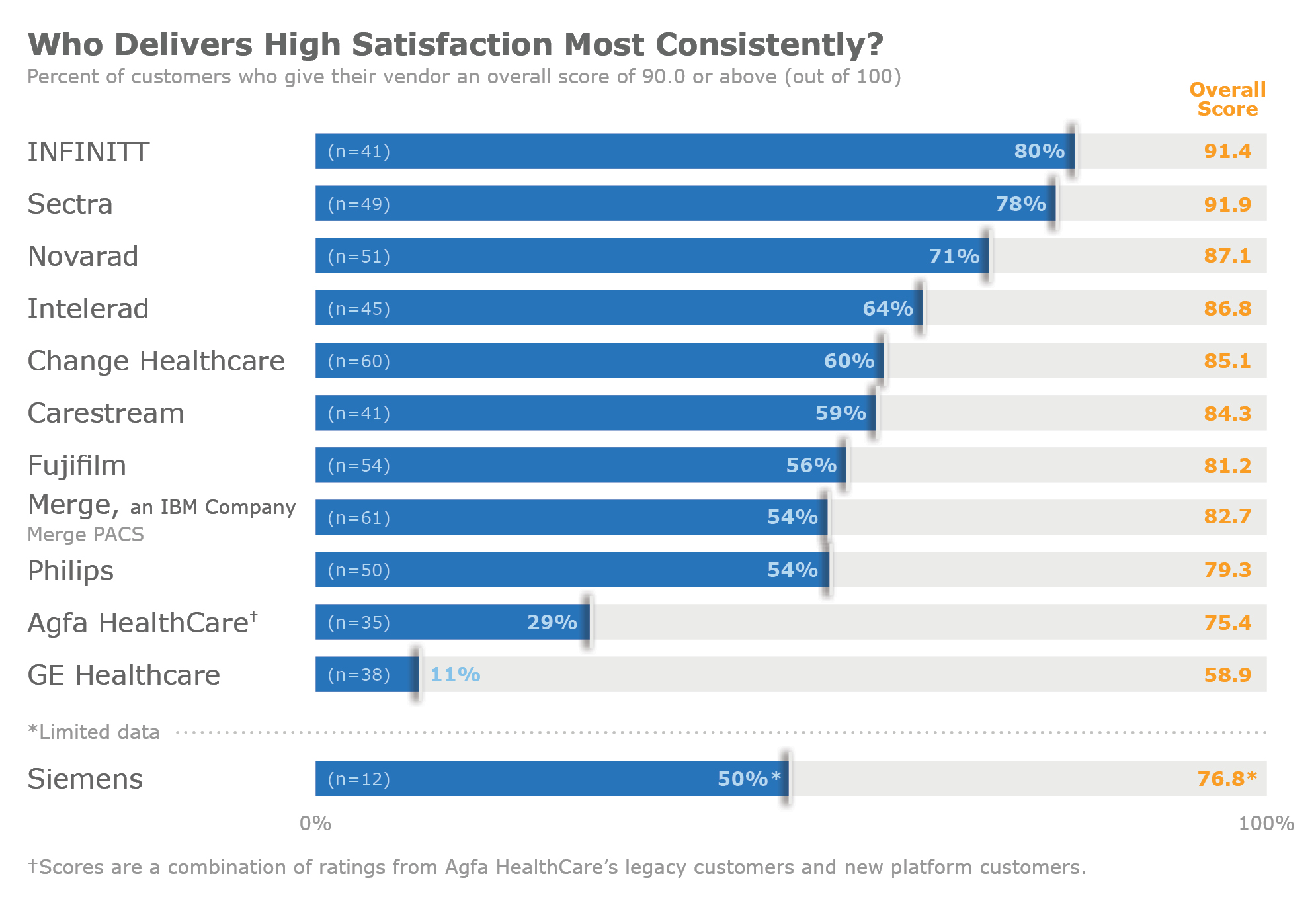 The most highly satisfied PACS customers are with Sectra and Infinitt. Sectra’s commitment to pro-active customer service, continual product improvements and superb training helps users achieve quick wins. Infinitt holds a similar position. While some customers would like quicker follow-up on tickets, most are exceptionally happy with the vendor’s product development and fair treatment.
