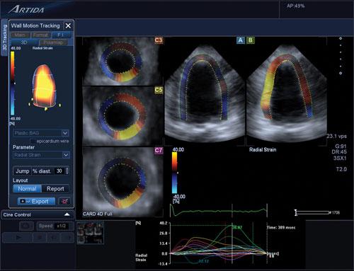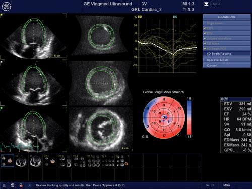 One cardiac ultrasound innovation that is widely used to assess cancer patients’ hearts is echo strain imaging. This advanced visualization software allows simultaneous assessment of three different views of the myocardium. The software allows quantification of the amount of left ventricular (LV) systolic function muscle strain in each view. Storozynsky said strain imaging can show microscopic changes in movement of the myocardium prior to the presentation of symptoms.