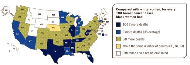 - Black women have 9 more deaths per 100 breast cancers diagnosed compared to white women.