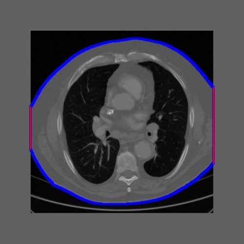 Figure 1: Example of an intentionally truncated CT image. The truncation percentage was calculated as the ratio of the patient border touching the field of view to the total patient border (red/(read+blue)). Image courtesy of Qaelum.