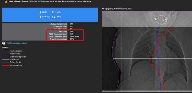 Although defining the Diagnostic Reference Levels for a specific patient size range allows the exclusion of overweight and obese patients, the truncation of the image could lead to a bigger patient being falsely identified as “standard-sized” and generate a dose alert. Knowing the effects of truncation on the calculation can assist in excluding dose alerts from the daily workload.