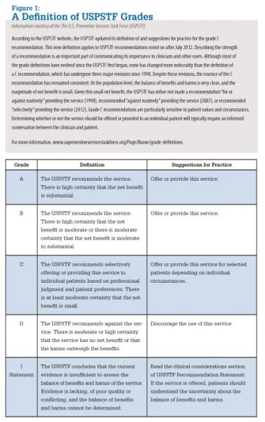 As of April 20, 2015, the USPSTF screening recommendations were proposed as follows. For a complete definition of what these grades mean, see Figure 1: A Definition of USPSTF Grades.