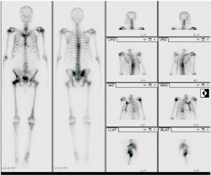 The first trial of an α emitter in TRT was reported in 1997.9 Although TRT has been used for the palliation of patients with metastatic prostate cancer to bone for several years, Ra-223-dichloride (Xofigo; Bayer Healthcare Pharmaceuticals) was the first radiopharmaceutical shown to extend life in men with castration-resistant disease.10 Indeed, since FDA approval for the use of Xofigo in men with castration-resistant prostate cancer was obtained in 2013, this has become increasingly prevalent in routine oncologic clinical practice as a way to target and treat bone metastases. Figure 2 shows a patient with prostate cancer and widespread bone metastases.
