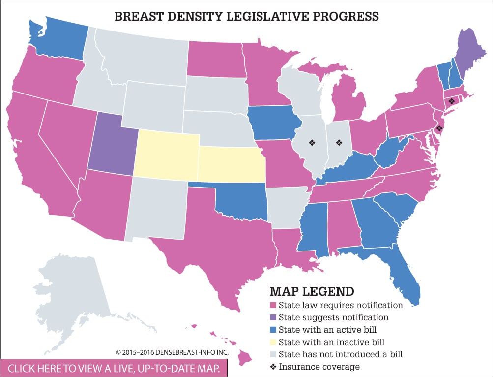 To date, 24 U.S. states have adopted legislation requiring healthcare providers to notify women whose mammograms reveal dense fibroglandular breast tissue. To track the progress of legislation across the country, DenseBreast-info.org has created a color-coded map separating states into six categories: States with a law requiring notification on the books (24); states that suggest notification (2); states with a 2015 or 2016 bill (11); states with an inactive bill (2); states with no active bill (15); and states that offer some level of insurance coverage related to breast density screening (4). Federal legislative efforts are ongoing. (See Breast Density Legislative Progress.)