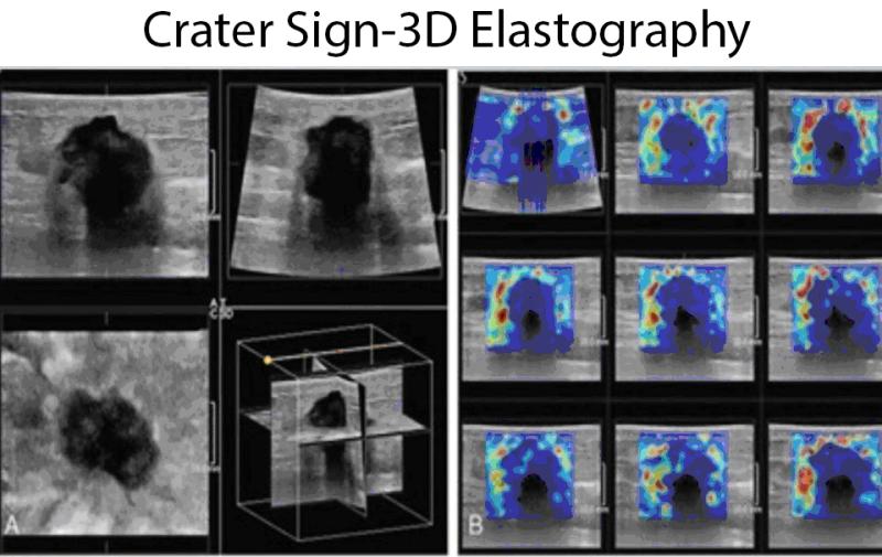 Advances in ultrasound elastography progressed from simple strain imaging to shear wave sonography, to 3-D coronal shear wave elastography where the plane of the image corresponds to the surgical field as the tumor is dissected in the most superficial plane. The tumor desmoplasia in the coronal plane creates a sawtooth irregular border with a central echo pattern simulating a “donut” and is termed the “crater” sign in this increasingly popular imaging paradigm. Elastography is used worldwide primarily in the diagnostic workup of breast, thyroid and prostate tumors, and has reduced the number of biopsies on false positive findings from mammography, b-mode ultrasound and MRI.10