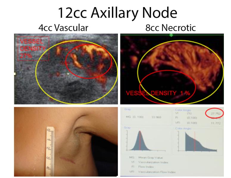 Lymph node assessment is possible at the same time. Under sonographic guidance, biopsies may be obtained. Sonographic criteria for malignancy are published elsewhere. Image guidance of enlarged node can distinguish between active tumor and necrotic areas diminishing necessity of repeated aspirations for indeterminate findings. (See Figure 2.) Pathologic assessment of a large post-operative specimen may be facilitated by high frequency scanning to re-localize the suspect region for targeted study that has been removed from its previous anatomic position.6 Elastography is useful in targeting sub-centimeter foci in large nodal masses.