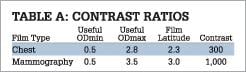 The characteristics of mammography film relate very strongly to the ergonomics and design of the mammography reading room. Softcopy displays are measured in contrast ratio; mammography film is measured in optical density. The contrast ratio equivalent to mammography film is about 1,000:1. Specialized softcopy displays used for mammography allow similar brightness and contrast. (See Table A for an example.)