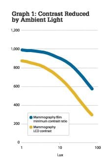 In Graph 1, the greater sensitivity to ambient light of the LCD is shown. With ambient illumination above 10 lux, the LCD begins to exhibit decreasing levels of contrast, resulting in a brighter black level than that portrayed in a typical mammography film on a view box. A reasonable level of ambient illumination when using displays of 500-600 cd/m2 is 5 lux. With brighter displays, proportionally more ambient illumination is appropriate.
