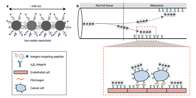 Figure 1. Illustration of (a) the iron oxide nanochain and its constituent components, and (b) targeting of the nanoparticles to a metastatic site. Inset: Interactions of circulating tumor cells and vascular bed.