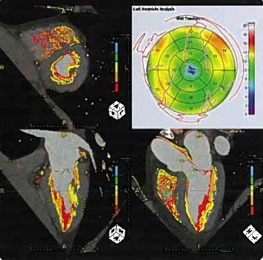 Vital Images gained FDA-clearance for its CT Myocardial Analysis software in late November. The company is careful not to say "perfusion" imaging because of the limits of its FDA indication, but that is essentially what it does. It creates a color-coded map of contrast levels in the myocardium during the cardiac cycle. This map can be viewed as a bulls-eye target or as an overlay over a 3-D rendering of the heart. Areas of low contrast, thus poor perfusion, correspond with areas of ischemia or infarct.