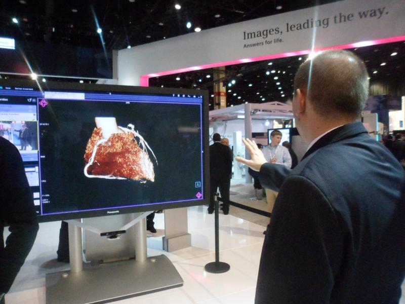 Siemens showed a work-in-progress system to allow OR surgeons or cath lab interventionalists to use mid-air hand motions to select a 3-D image on screen and allow hand motions to rotate the image. The technology would give the physician complete control of 3-D reference images without the need to touch anything or verbally instruct techs on how to manipulate the image remotely.