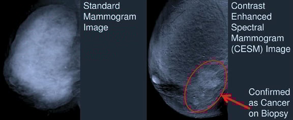 Maha Helal, M.D., professor of radiology at Ain Shams University in Cairo, Egypt, presented information on the use of CESM in comparison to contrast-enhanced breast MRI. CESM provides comparable information to MRI in detecting ductal carcinoma in situ (DCIS), said Helal, and is approximately one-tenth the cost and is shorter in duration. And while MRI is the most sensitive imaging test for cancer detection, according to Helal, it lacks specificity.