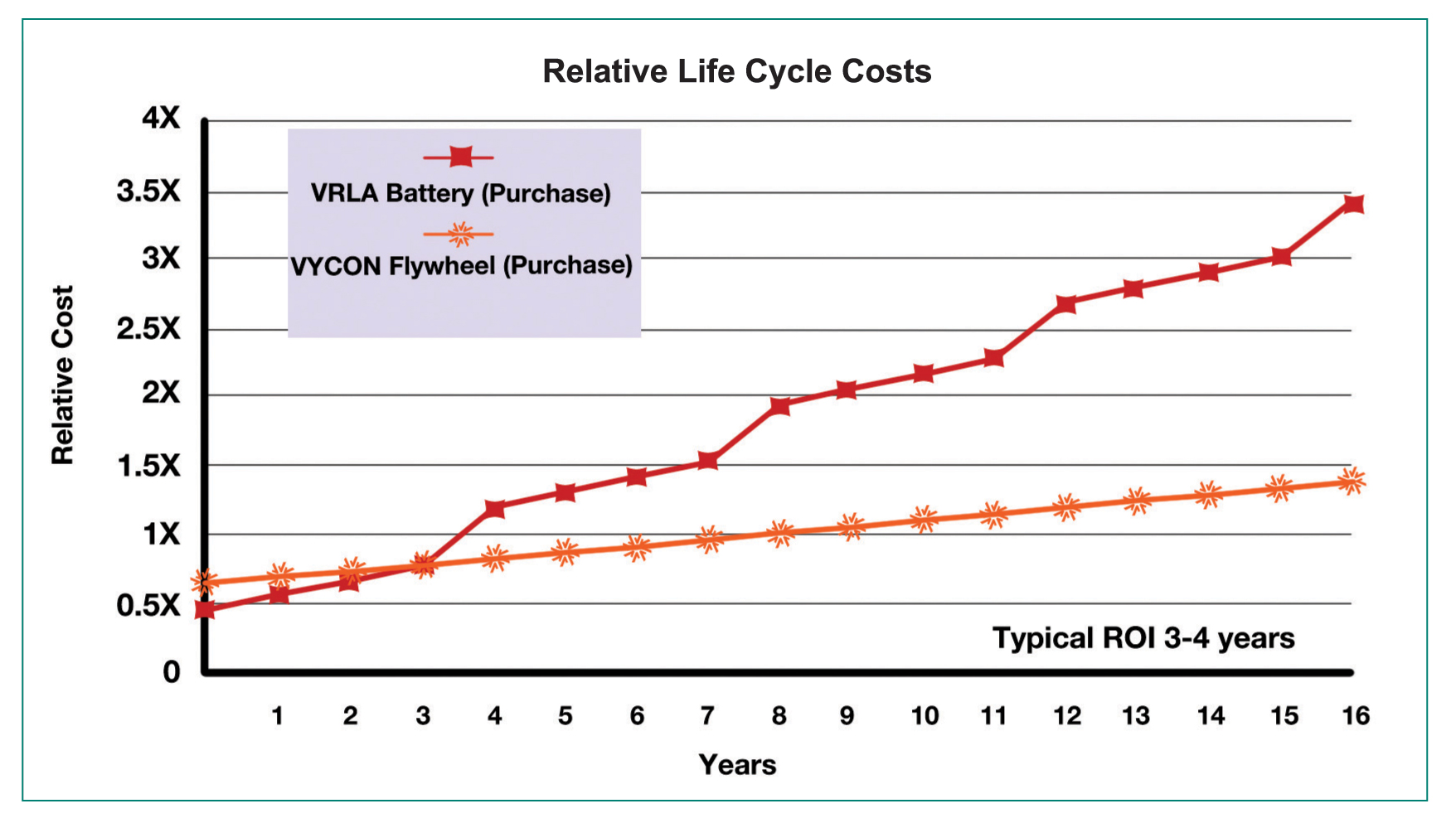 Over a 16-year period, air conditioning, high maintenance and frequent cell replacements of batteries can cost 3.5 times as much as a flywheel power system on a life cycle basis.