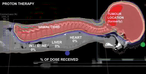 The proton treatment plan for 5-year-old Ashya King, who made headlines in 2014 after his parents were arrested for taking him from a National Health Service (NHS) hospital in the U.K. and bringing him to a proton therapy center in the Czech Republic for treatment. Proton therapy was not available in the U.K. The boys cancer went into complete remission after the proton treatments. This treatment plan, overlaid on the CT scan, shows the proton delivery zones without penetration into health tissue in the child's thorax or abdomen.