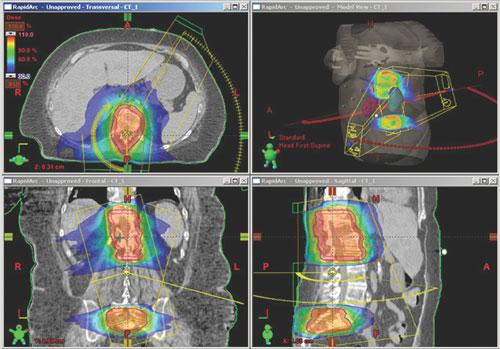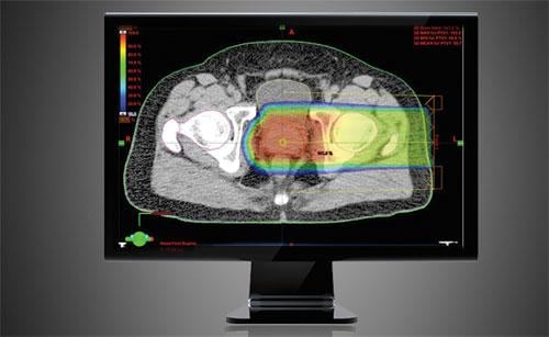 The path of proton beams can be planned using 3-D anatomical reconstructions made from CT datasets. The anatomical structures the proton beam passes through are assigned HU attenuation numbers and the software calculates the proton relative stopping power and the energy levels required to accurately stop the protons inside the tumor.