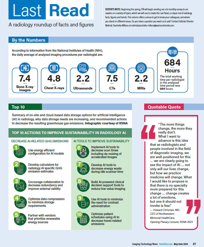 Beginning this spring, ITN will begin sending out a bi-monthly survey to our readers on a variety of topics, which we will use to create the Last Read, a unique mix of radiology facts, figures and trends. This column offers a venue to get to know your colleagues, and where you stand on different issues. Do you have a question you want us to ask? Contact Editorial Director Melinda Taschetta-Millane at [email protected].