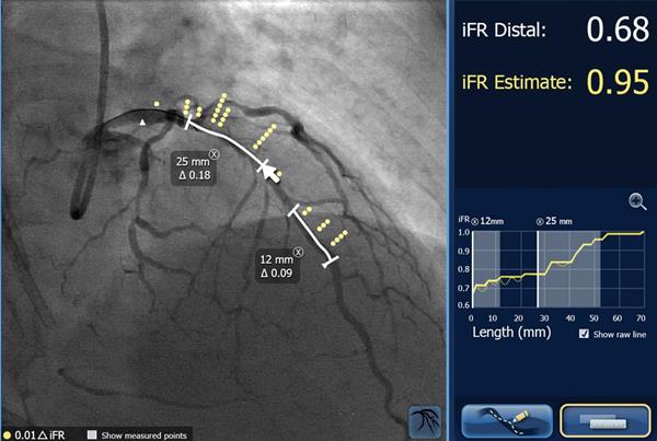 Pressure sensors located at different points along the iFR wire may show differences in pressure. These differentials may be apparent, when the wire is pulled back from the initial treatment site. If the pressure drops, the interventionalist knows that residual stenosis lies somewhere between the two pressure sensors, Davies explained. The Philips Healthcare SyncVision iFR Co-registration maps the pressure readings onto the angiogram.