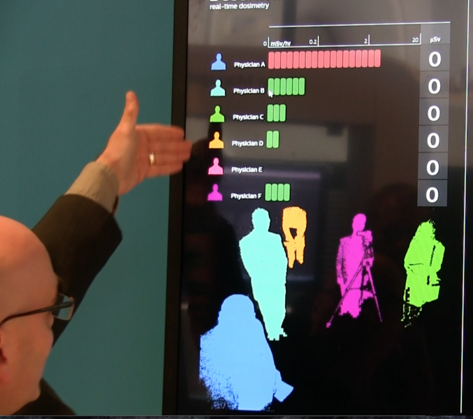The DoseWise solution also integrates with DoseAware Xtend for staff exposure data. It is an advanced version of the Unfors RaySafe system, combining real time radiation detection badges and a live video screen showing each person in the cath lab in a different color. The system reports their real-time exposure rate and cumulative dose since the start of a procedure. The visual presentation on the screen and alert warnings remind staff to step back out of the radiation field to reduce exposure.