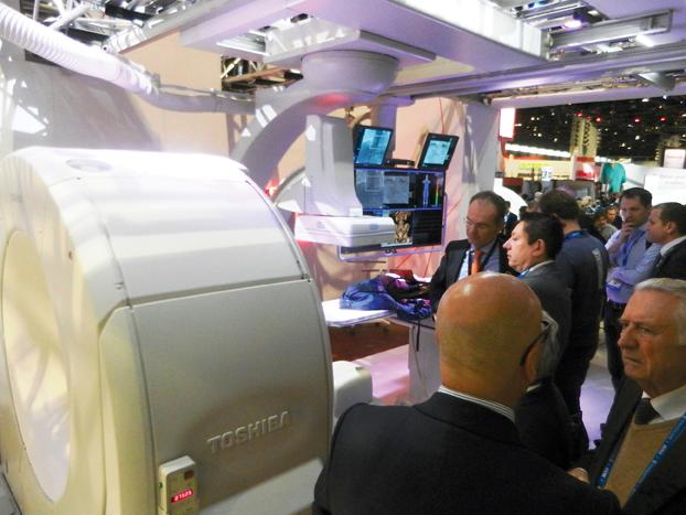 Toshiba America displayed its first entry into molecular imaging hybrids, the Celesteion PET/CT, first revealed at the June 2013 Society of Nuclear Medicine and Molecular Imaging meeting. The company hopes to attract buyers with increased patient comfort and safety, claiming the industry’s largest bore, widest field-of-view, dose reduction technology and fast imaging. The bore is 90 cm for CT; 88 cm for PET. Field-of-view is 70 cm for both CT and PET with an 85 cm CT extended FOV. Dose is minimized through Toshiba’s adaptive iterative dose reduction and Celesteion’s compliance with the Medical Imaging and Technology Alliance’s XR-29 Smart Dose Standard. The new PET/CT offers time-of-flight resolution and 0.5 sec CT rotation with 0.5 mm slices across a 32-slice detector.