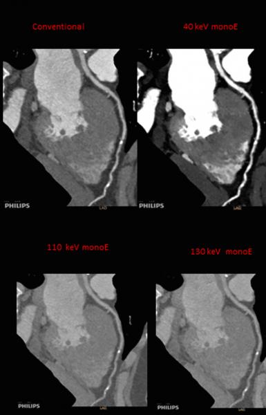 There has been a renewed interest in the development of spectral CT over the past couple years. Spectral imaging allows viewing of the same anatomy at two different kV energies. Different anatomical features are enhanced and easier to see at different energy levels. Additionally, spectral software can highlight or eliminate specific chemical compounds based on their atomic number, including iodine and calcium. This allows differentiation between calcified coronary lesions and iodine contrast in the blood vessel, or enables reconstruction of contrast and non-contrast images from a single contrast scan.