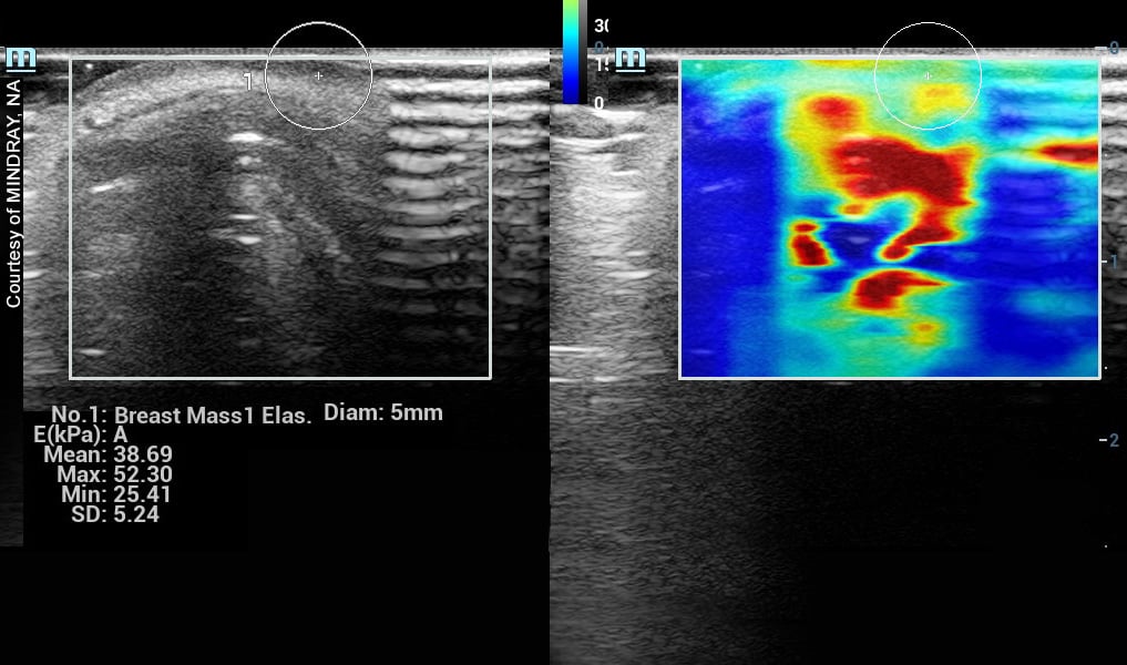 Another example of a dense breast shows the difference between homogeneous white versus the whitish area (see Image 3). This is filled with dark, wormy looking structures, which are the breast glands called glandular tissue. This kind secretes milk and its glands are often dilated. Both fibrous and glandular may appear similar under a mammogram as highly dense areas, but they look completely different under an ultrasound scan. Through ultrasound, we can check for tumors easily through fibrotic dense breasts because it stands out as a black region (or a black hole) within the white area. As shown in Image 3, a black hole could get lost, making it more difficult to image this type of dense breast. In this case, a solution is the use of elastography (see Image 4), which offers visual confirmation as indicated by color data. Elastography can measure tissue density (its hardness or elasticity) within the glandular breast tissue.