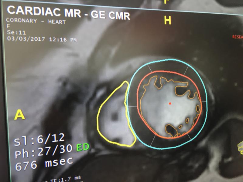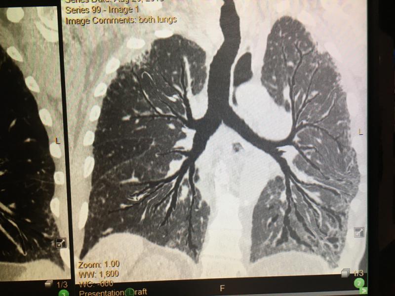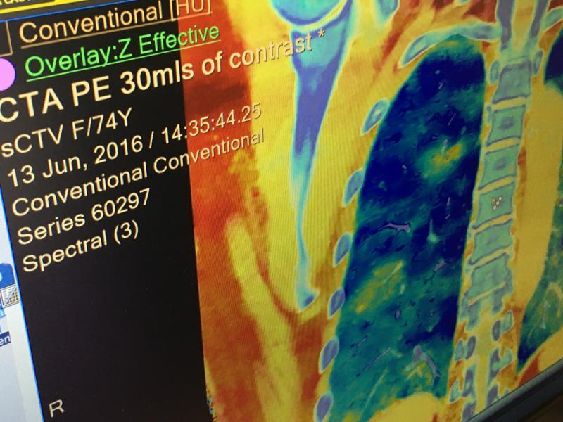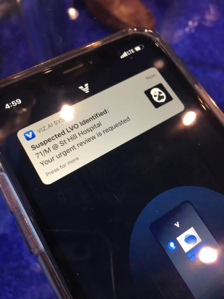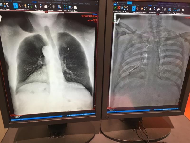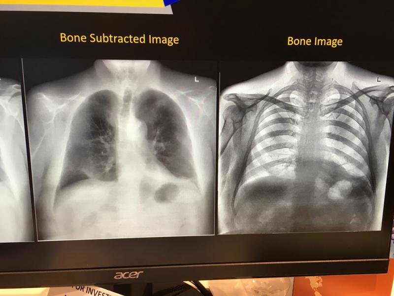 This is a lung X-ray reviewed automatically by artificial intelligence (AI) to identify a collapsed lung (pneumothorax) in the color coded area. This AI app from Lunit is awaiting final FDA review and in planned to be integrated into several vendors' mobile digital radiography (DR) systems. Fujifilm showed this software integrated as a work-in-progress into its mobile X-ray system at RSNA 2019. GE Healthcare has its own version of this software for its mobile r=ray systems that gained FDA in 2019.