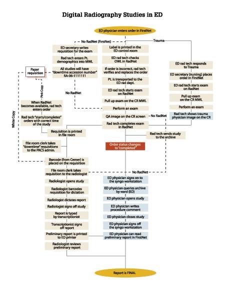 At that time, the major focus of the PACS implementation was on making image workflow not only filmless, but also paperless. To achieve this goal and to provide ED physicians with an electronic form of communication with radiologists, a set of business rules were implemented.
