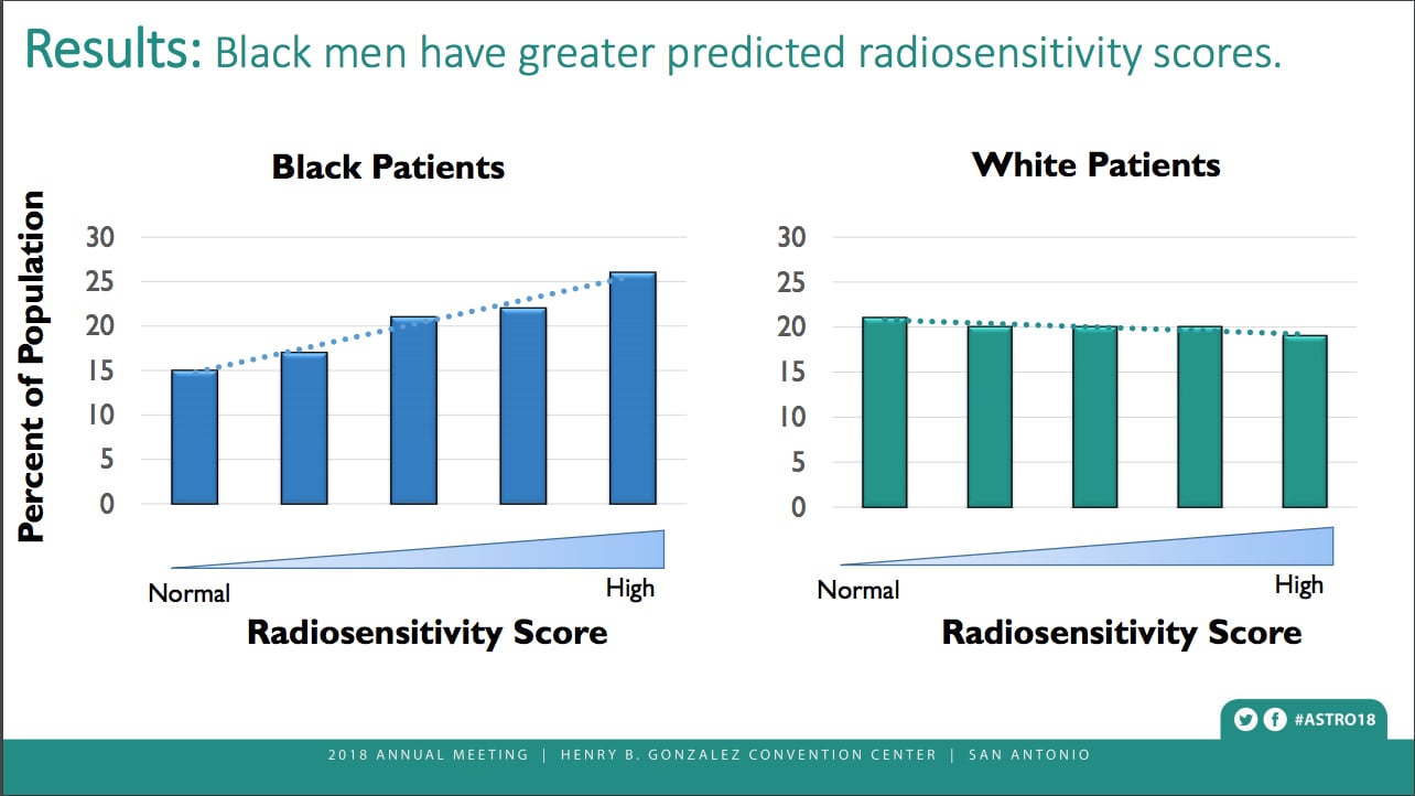 Tumors from African-American men also were more likely, however, to have indicators of increased sensitivity to radiation therapy: decreased expression of the double-strand DNA repair pathway (p<0.001), increased expression of immune pathways (p<0.001), and increased radiosensitivity as predicted by a 24-gene prostate cancer radiation sensitivity score developed by the research team. Increased radiotherapeutic sensitivity suggests that African-American patients have improved outcomes when treated with radiation.