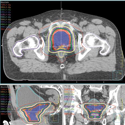 The general approach has come to be known as volumetric modulated arc therapy (VMAT). The biggest appeal of VMAT is the reduction in treatment times compared to traditional IMRT, since there is no wasted time, as gantry rotation, MLC movement and radiation delivery all happen simultaneously. (See Figure 1, which shows an axial view of a VMAT plan for prostate cancer treatment.)