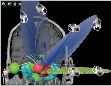 This is an example of a treatment plan with three Hybrid-Arcs within a challenging area of the brain, utilizing arc modulation techniques.