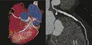 Coronary CTA on the Somatom Force produces high-resolution stent imaging with a 0.18 second scan at 70 kV exposing the patient to just 0.43 mSv. The patient's heart rate varied between 58 to 70 bmp during the exam. Color image shows two long stents. The curved MPR image in grayscale shows the details in the LAD stent. Image provided by Siemens Healthcare, copyright Institut fur Klinische Radiologie und Nuklearmedicin, Universitatsmedizin Mannheim Medizinische Fakultat Mannheim der Univesitat Heidelberg