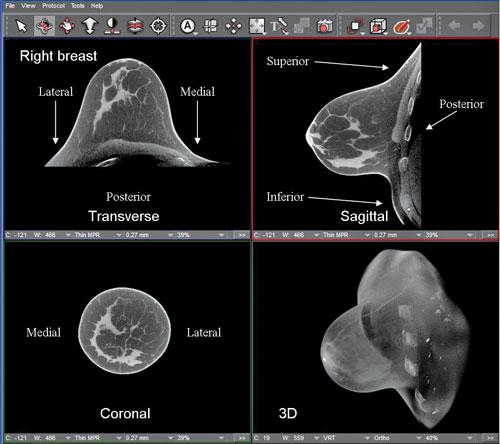 A new CT innovation is also being employed to reduce the need for breast compression during mammography, a procedural aspect greatly disliked by patients. Koning Corp. offers a novel solution to the problem with its Koning Breast CT (KBCT) system, which does a full 360-degree rotation around the breast to perform isotropic imaging without compression; this is decidedly different than tomosynthesis, which performs a limited sweep and thus requires compression, according to David Georges, senior vice president, sales and marketing, for Koning Corp. Radiation dose for the procedure is within the range accepted for diagnostic mammography.