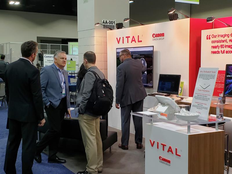 12:53 pm — Vital Images (which has joined Canon Medical) features an optical camera designed specifically for enterprise imaging. The camera downloads patient data either from the patient wristband or a computer work list, associating those data with the appropriate patient record and treatment information. It also measures automatically the distance from camera to subject — for example, a pressure ulcer of the skin — adjusting the image to ensure an “apples to apples” comparison of prior and current images. This helps the physician determine if the wound is getting larger or smaller over time, a rep told me.