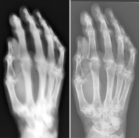 A comparison of an X-ray of a hand using 1896 technology (left) and a modern digital radiography X-ray system.