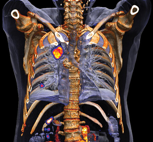 Early detection of cancer lesions with the latest generation of PET/CT scanners supports improved patient management. Yet much of PET’s potential, particularly for following patients and as a component in PET/MR, remains unrealized. (Image courtesy of Siemens Healthcare and the University of Tennessee, Knoxville)