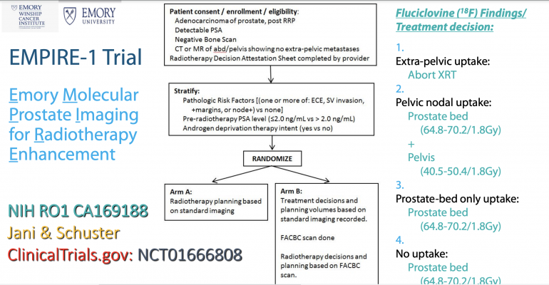 The Emory Molecular Prostate Imaging for Radiotherapy Enhancement, or EMPIRE-1 trial (NCT01666808), enrolled 165 patients who had undergone prostatectomies, but who later showed abnormal PSA blood test scores, indicating their cancer was returning. All patients underwent conventional imaging (bone scans, CT or MRI) for initial treatment planning. Patients were then randomized into two groups. The first group received radiation therapy based on these initial treatment plans. The other group was given fluciclovine PET scans and treated based on the additional findings.