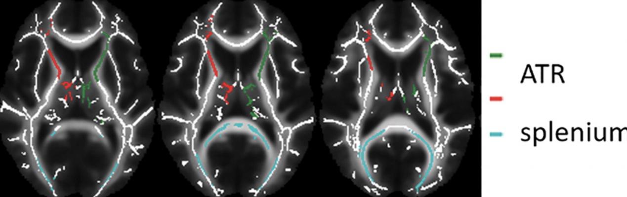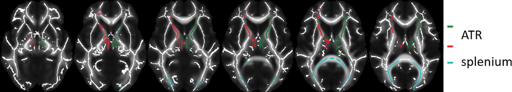 Images of regions of interest (colored lines) in the white matter skeleton representation. Data from left and right anterior thalamic radiation (ATR) were averaged. Image courtesy of C. Bouziane et al.