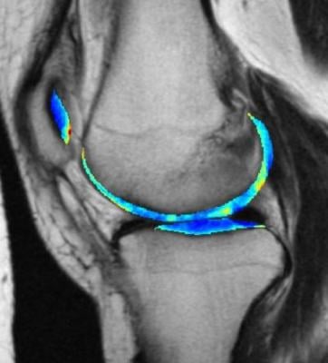 The cartilage in this MRI scan of a knee is colorized to show greater contrast between shades of gray. Image courtesy of Kundu et al. (2020) PNAS