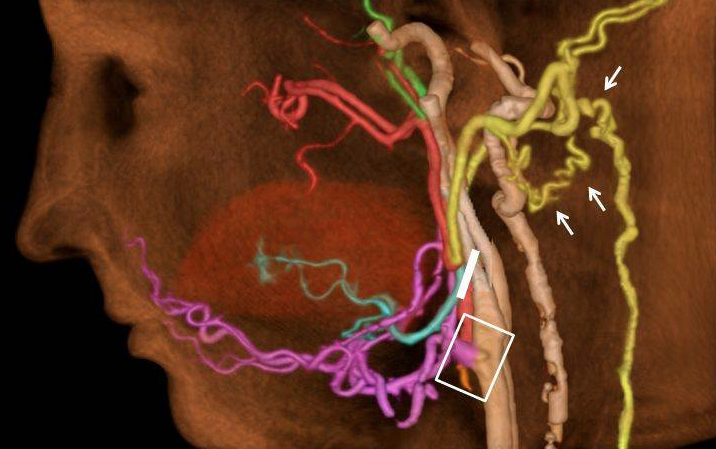 Results showed that the new blood vessel networks course posteriorly, or toward the ears and even farther behind the head, in addition to the large arteries and veins that course anteriorly in the face, or close to the jaw.