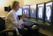 Dr. Gerety, a radiologist at St. Mary's Hospital, is sitting at the AMICAS PACS workstation.