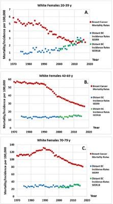 Comparison of breast cancer mortality rates (red squares) and distant-stage breast cancer incidence rates from SEER9 (blue dots) and SEER18 (green dots) per 100,000 for white women aged, A, 20–39, B, 40–69, and, C, 70–79 years (3,7,8). Image courtesy of Radiology