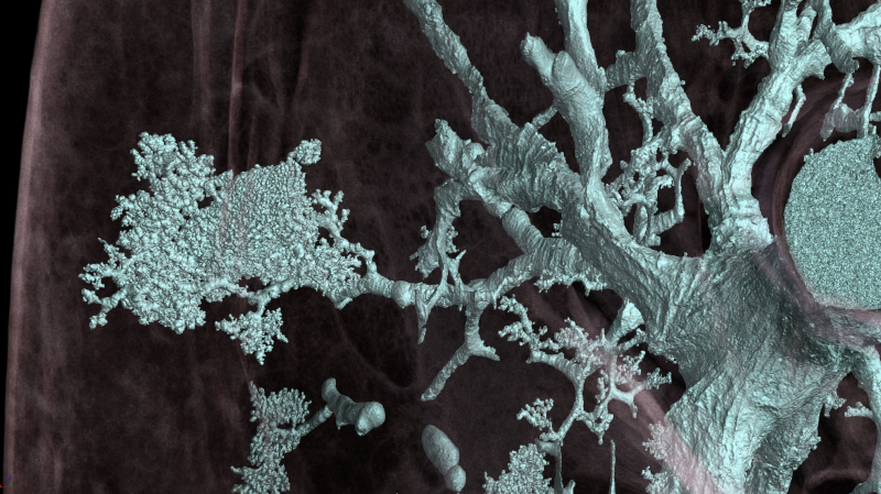 Using HiP-CT, the research team, which includes clinicians in Germany and France, have seen how severe Covid-19 infection ‘shunts’ blood between the two separate systems – the capillaries which oxygenate the blood and those which feed the lung tissue itself. Such cross-linking stops the patient’s blood from being properly oxygenated, which was previously hypothesised but not proven.