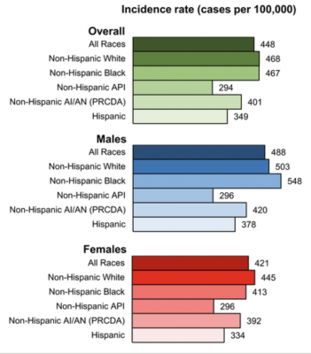 For cancer incidence, notable findings include that from 2012 to 2016, incidence rates for all cancers combined were stable in men and increased slightly in women. In addition, rates of new cancers were stable among white men and decreased among black, Asian/Pacific Islander (API), American Indian/Alaska Native (AI/AN), and Hispanic men.