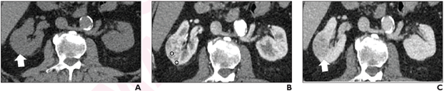 Schieda and colleagues’ study included 148 patients (mean age, 58 years; 73 men, 75 women) with 148 small (≤4 cm) solid (>25% enhancing tissue) renal masses that underwent renal-mass CT (unenhanced, corticomedullary, and nephrographic phases) before resection between January 2016 and December 2019. Two radiologists independently evaluated CT examinations and recorded calcification, mass attenuation in all phases, mass-to-cortex corticomedullary attenuation ratio, and heterogeneity score (5-point Likert scale, assessed in corticomedullary phase).