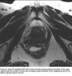 Axial T2 weighted MRI showing lateral deviation of the right vaginal wall.
